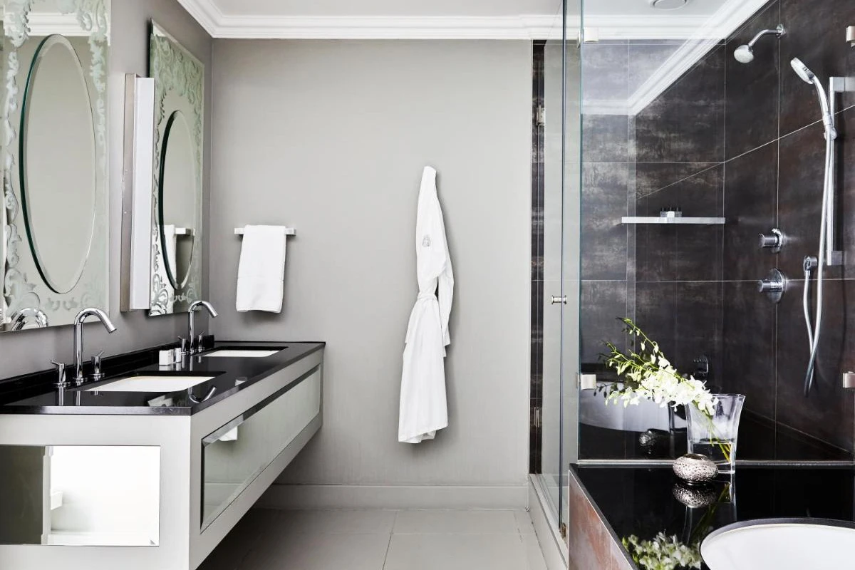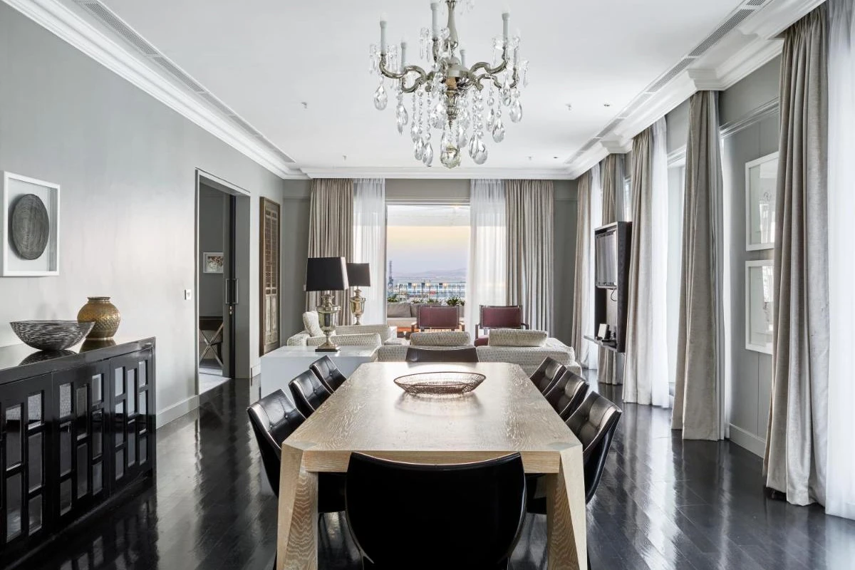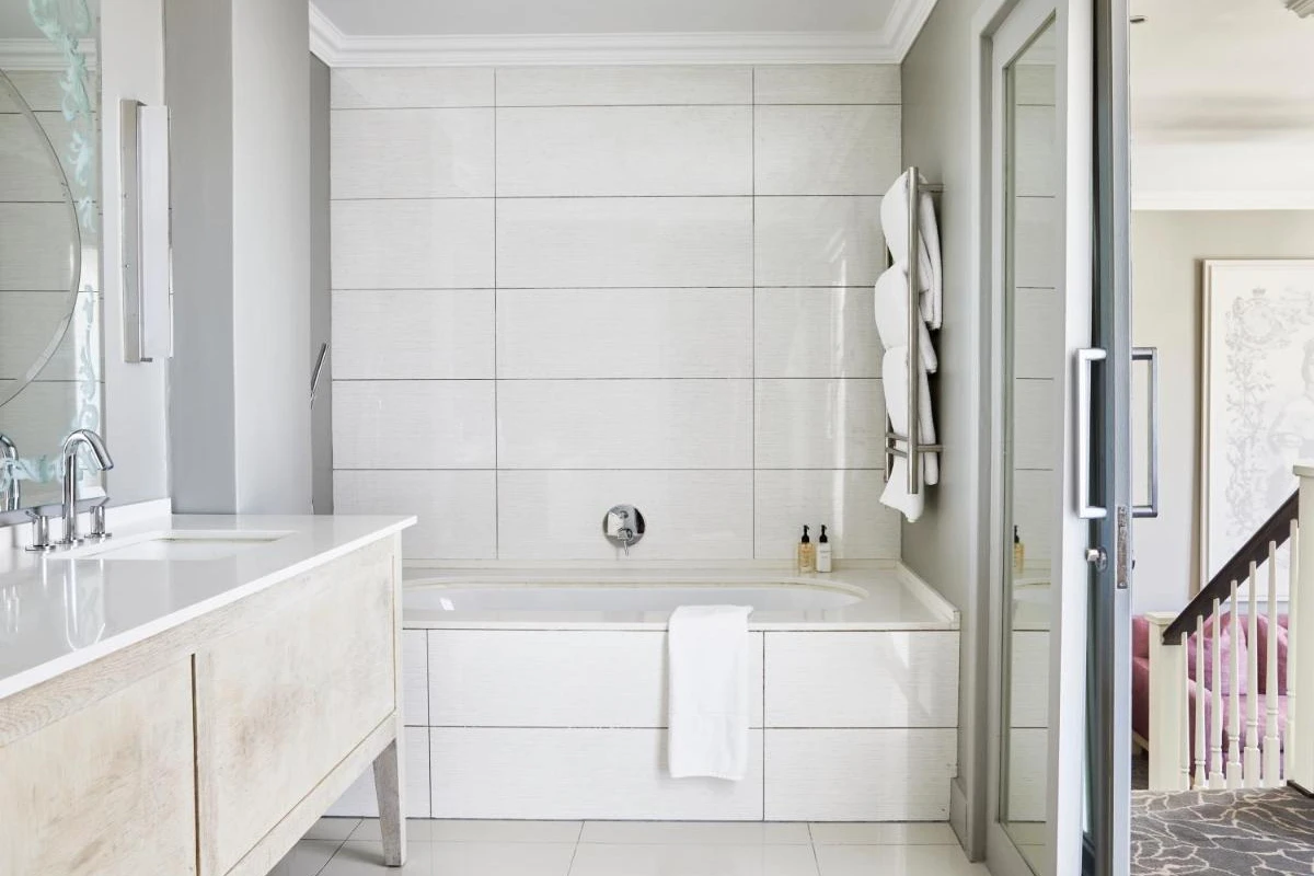 The hotel's regal ambiance shines through its triple-volume foyer, adorned with a dramatic spiral staircase, glass lift, crystal chandeliers, and white marble finishes. Its meticulously designed rooms and suites feature plush padded headboards, concealed lighting, velvet ottomans, Egyptian cotton sheets, and deluxe bathrooms with deep bathtubs, ensuring a luxurious haven for relaxation, recognised among South Africa's top 25 luxury hotels.
