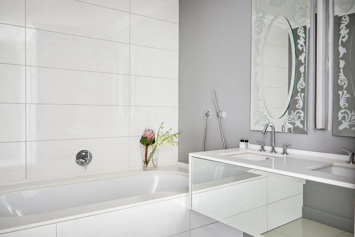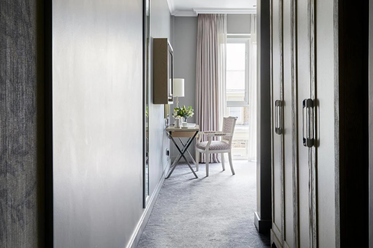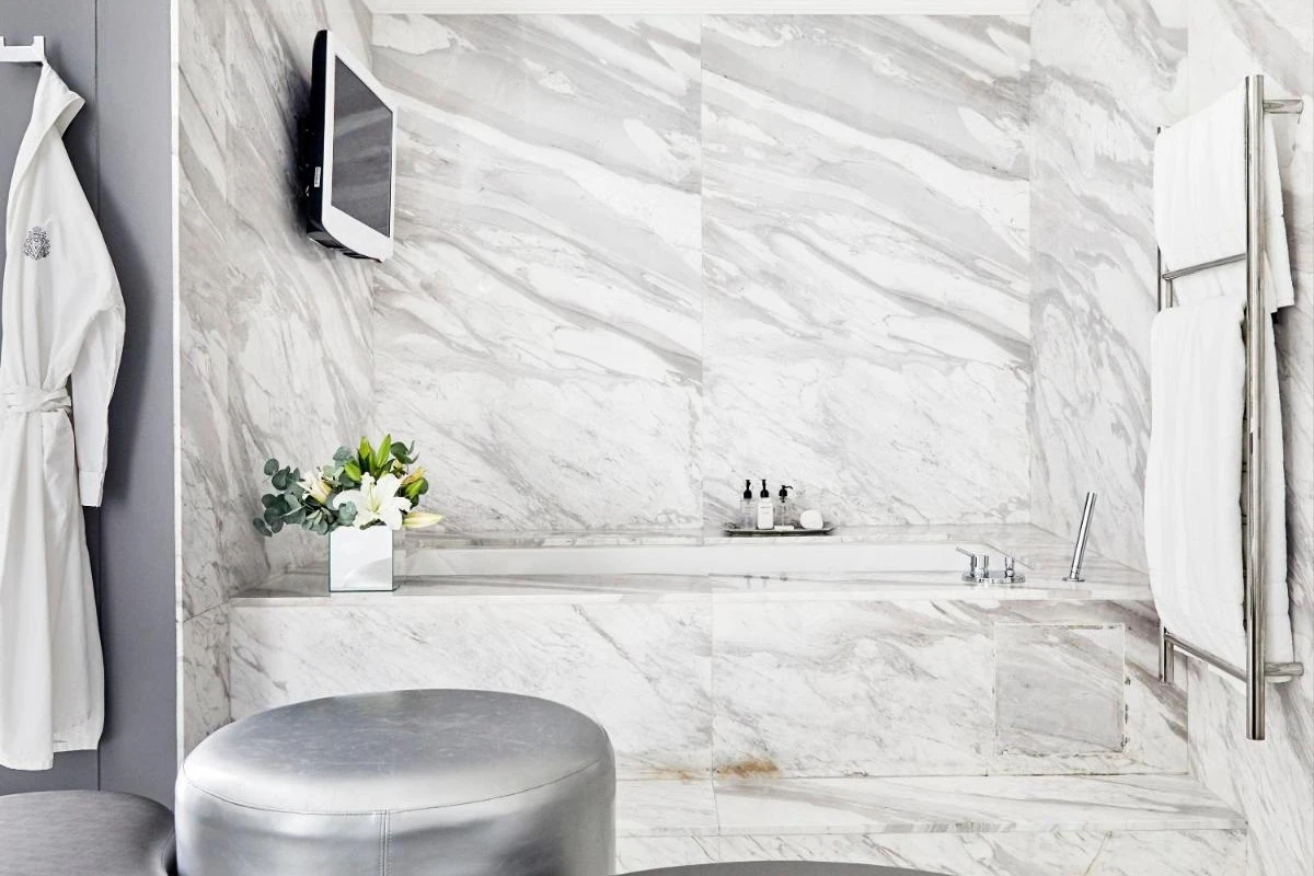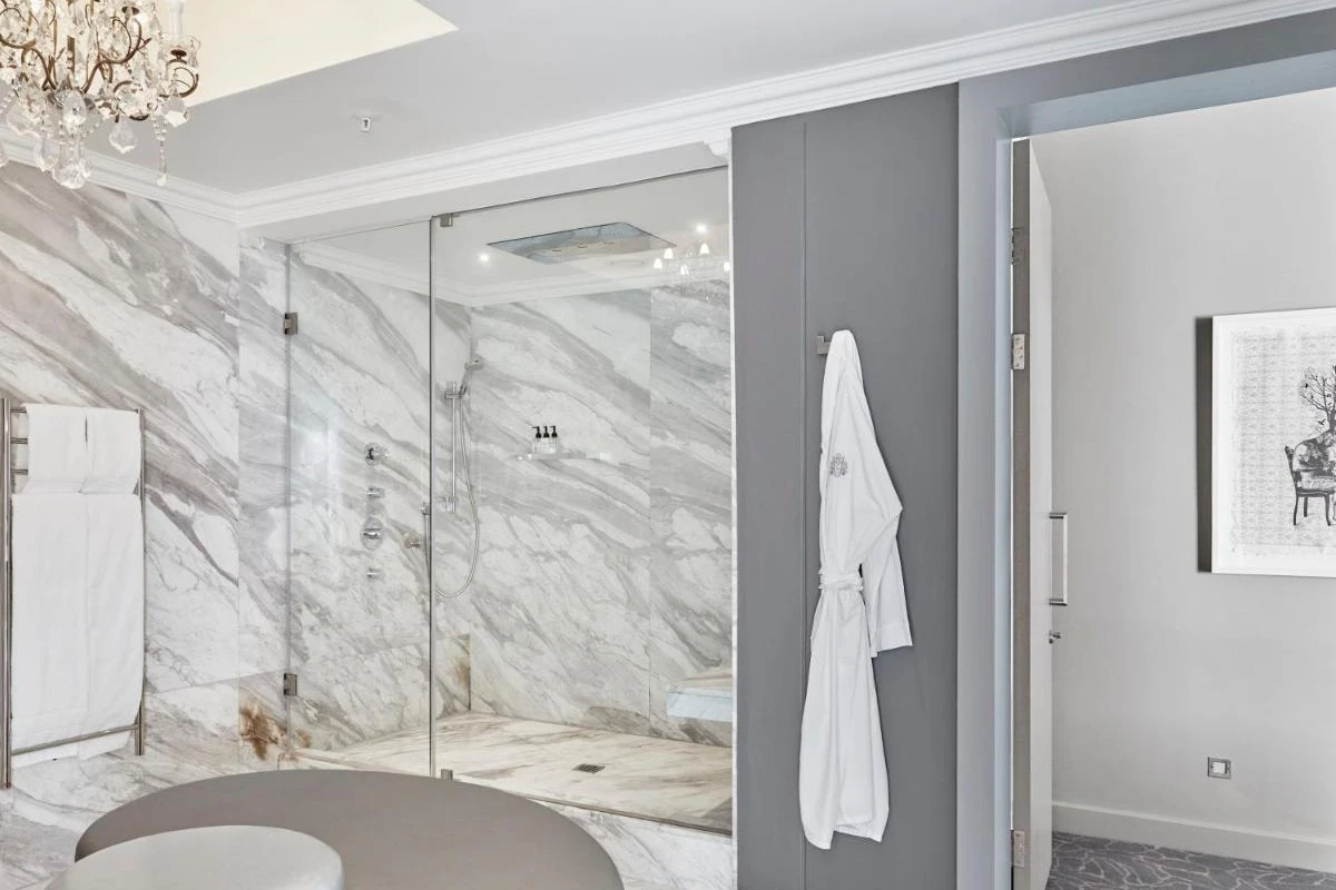 The hotel's regal ambiance shines through its triple-volume foyer, adorned with a dramatic spiral staircase, glass lift, crystal chandeliers, and white marble finishes. Its meticulously designed rooms and suites feature plush padded headboards, concealed lighting, velvet ottomans, Egyptian cotton sheets, and deluxe bathrooms with deep bathtubs, ensuring a luxurious haven for relaxation, recognised among South Africa's top 25 luxury hotels.