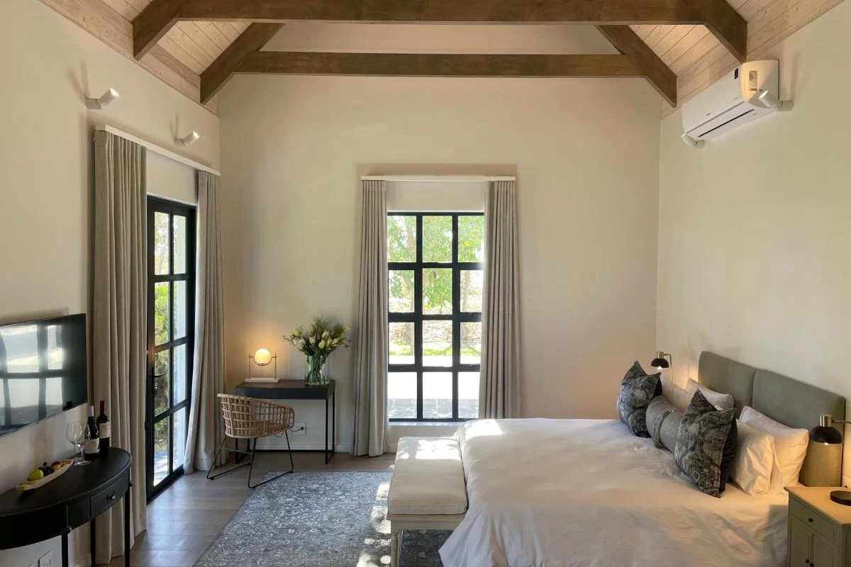 The three bespoke accommodation options—elegant rooms, suites, and cottages—feature air-conditioning, flat-screen televisions, coffee machines, minibars, safety deposit boxes, wardrobes, kettles, and private bathrooms with showers, with some boasting captivating mountain views. Each opens to a private patio, blending sophisticated comfort with the tranquil beauty of the estate's historic vineyards, ensuring a refined and intimate escape.