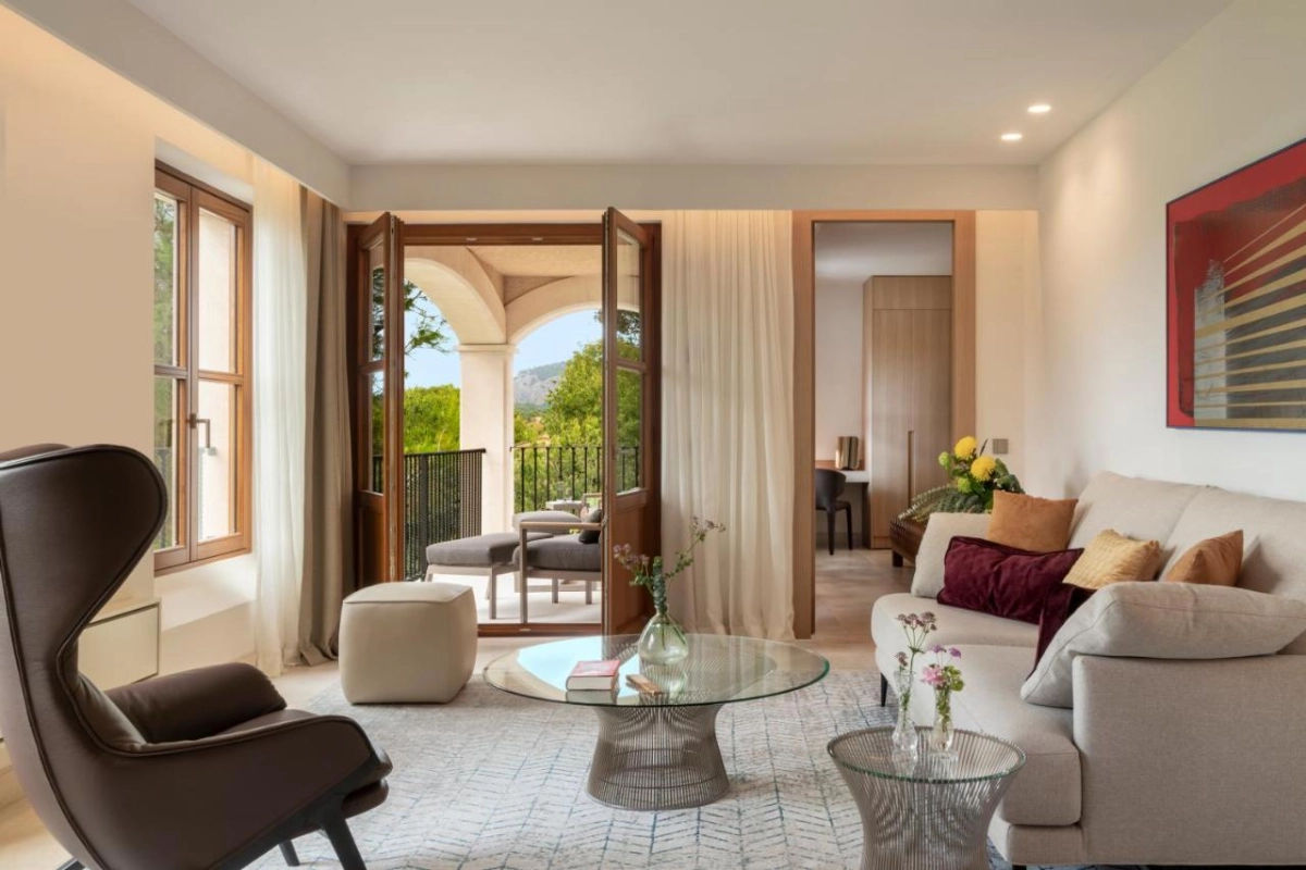 The 43 rooms and suites, reimagined by designer Danilo Silvestrin, unfold with refined warmth, featuring air-conditioned comfort, flat-screen TVs, coffee machines, minibars, safety deposit boxes, wardrobes, and sleek bathrooms with premium toiletries. Many offer private terraces, secluded gardens, or pools, creating tranquil havens where attentive staff ensure thoughtful details, from plush linens to warm welcomes, fostering a sense of belonging amid the Tramuntana foothills' rural beauty.