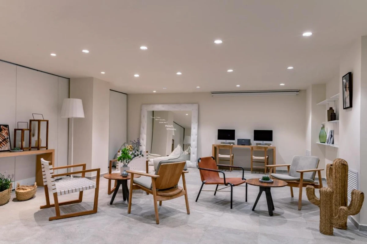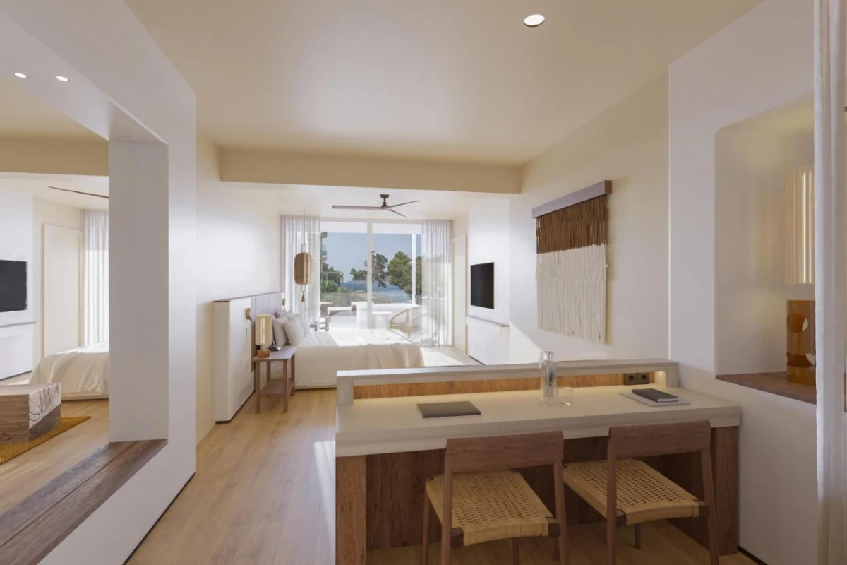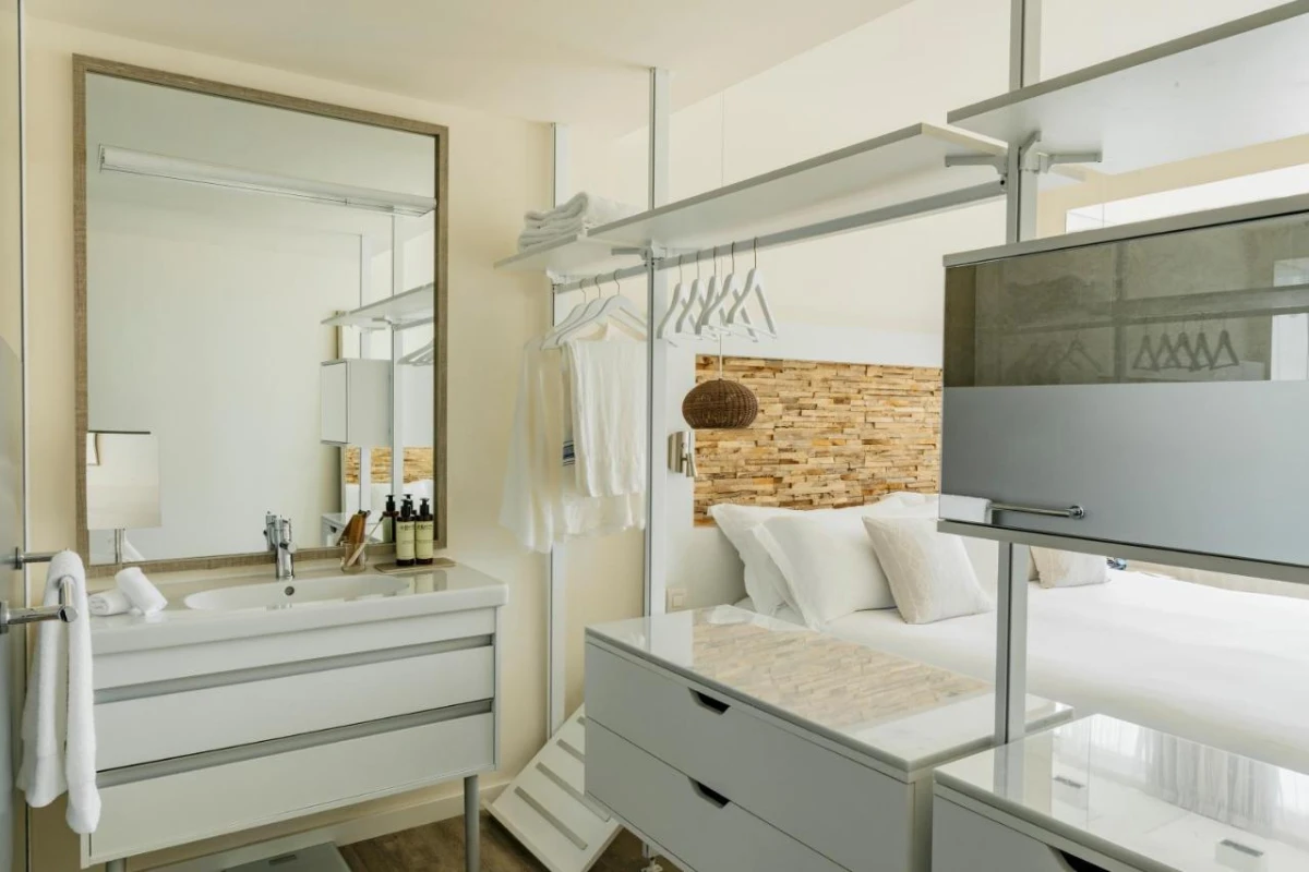 The stylish rooms and suites, ranging from ground-floor sanctuaries with direct pool access to upper-level retreats with sea vistas, feature air-conditioned comfort, Smart TVs with Chromecast, minibars, and private bathrooms with premium toiletries. Ground-floor suites include private gardens and sun loungers, while all rooms offer a complimentary bottle of water. Private balconies or terraces enhance the serene ambiance, blending modern luxury with Ibizan charm.