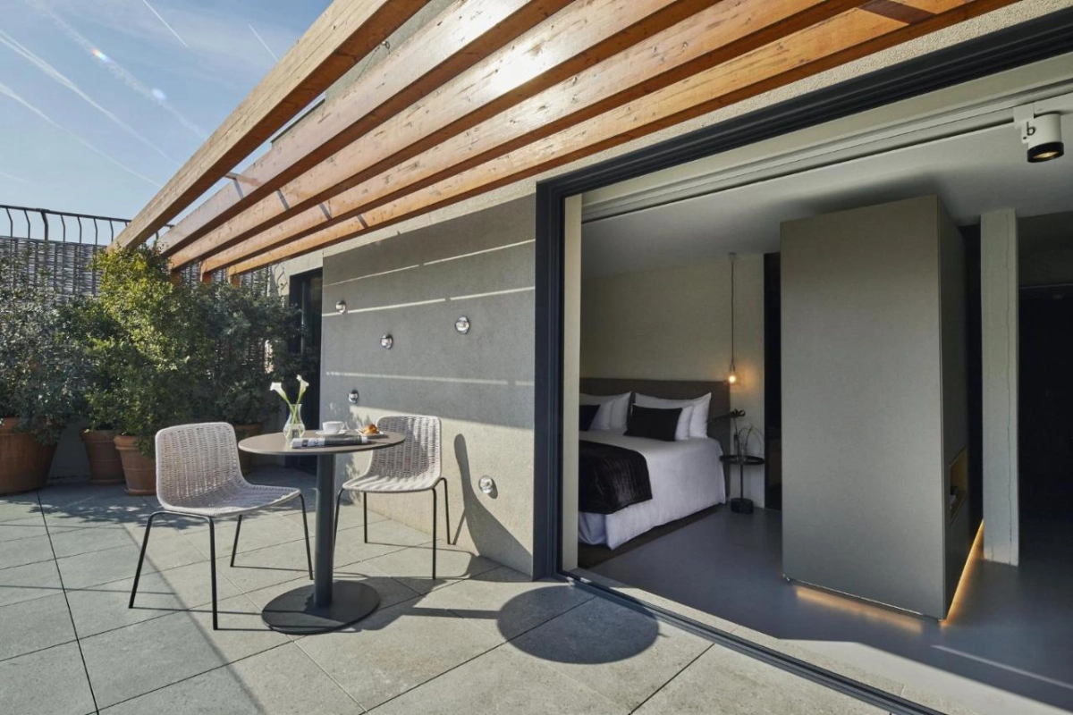 The 94 well-designed rooms, from Deluxe with balconies to Attic suites with terraces, unfold with industrial elegance, featuring air-conditioned comfort, 55-inch flat-screen TVs with eRoom Cast, minibars with local delicacies, and private bathrooms with rainfall showers or baths and designer toiletries. Exposed concrete, herringbone floors, and dimmable lighting create serene havens, where attentive staff ensure thoughtful touches, from plush linens to turndown service, fostering a sense of belonging amid the Eixample's lively pulse.