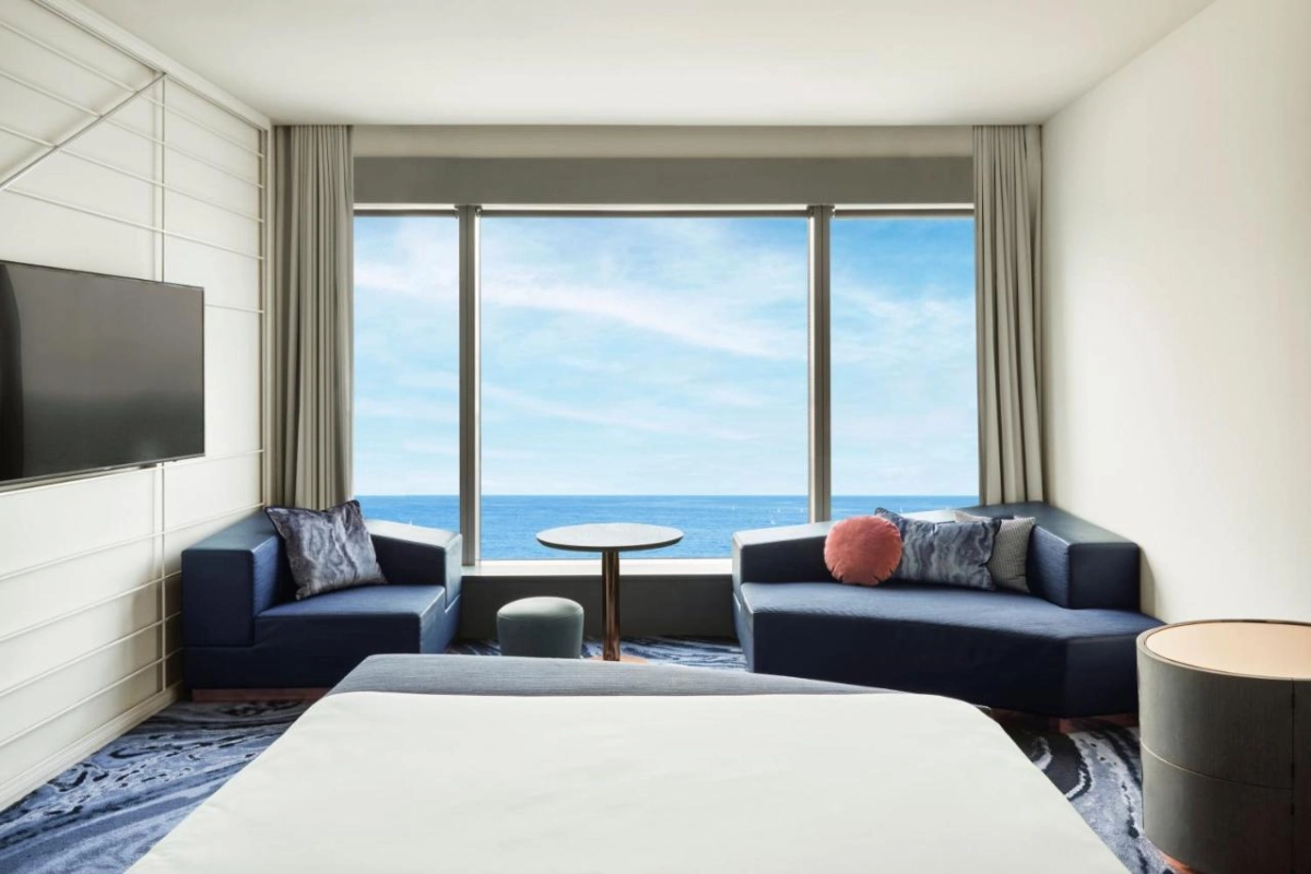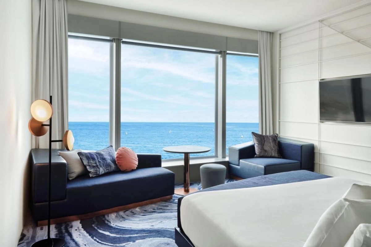 The 473 rooms, including the Fabulous rooms and suites, unfold with bold elegance, featuring air-conditioned comfort, flat-screen TVs, iPod docking stations, minibars with local gin, and sleek bathrooms with rainfall showers and Davines toiletries. Floor-to-ceiling windows frame jaw-dropping city or sea vistas, complemented by innovative lighting and chaise longues for daydreaming. Each creates a tranquil haven where attentive staff ensure thoughtful touches, from plush W signature beds with remote-controlled blinds to warm welcomes, fostering a sense of belonging amid the city's lively rhythm.
