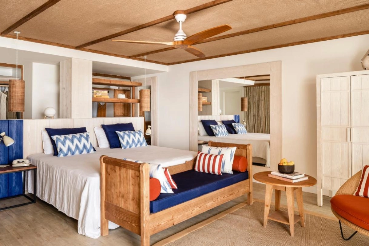 The 155 rooms, inspired by local aesthetics, feature air-conditioned comfort, flat-screen TVs, minibars, and private bathrooms with premium toiletries. Many open to balconies with stunning sea views, blending contemporary elegance with island tranquility, creating inviting spaces for relaxation.