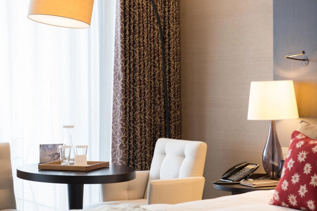 The hotel's rooms and suites exude warmth with rich hardwood floors, plush seating areas, and expansive windows framing breathtaking mountain views. Each accommodation is thoughtfully designed with private bathrooms featuring premium toiletries, satellite TVs, and well-stocked minibars for added comfort. Select suites offer spacious layouts, perfect for unwinding after a day on the slopes or exploring the alpine trails. The sleek, modern aesthetic paired with cozy touches creates an inviting atmosphere for relaxation.