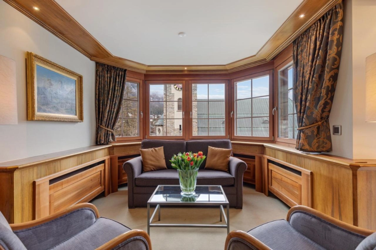 The hotel's 77 rooms and suites, each uniquely crafted, weave plush fabrics and polished wood with breathtaking views of Zermatt's jagged peaks or charming village lanes. Spacious interiors hum with warmth, featuring cozy seating areas, sleek flat-screen TVs, and coffee machines, while marble-clad bathrooms, stocked with sumptuous toiletries, offer tranquil escapes. Select suites boast private balconies, where the crisp alpine air and towering mountains create moments of quiet awe, marrying heritage with contemporary comfort.