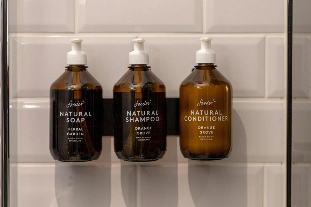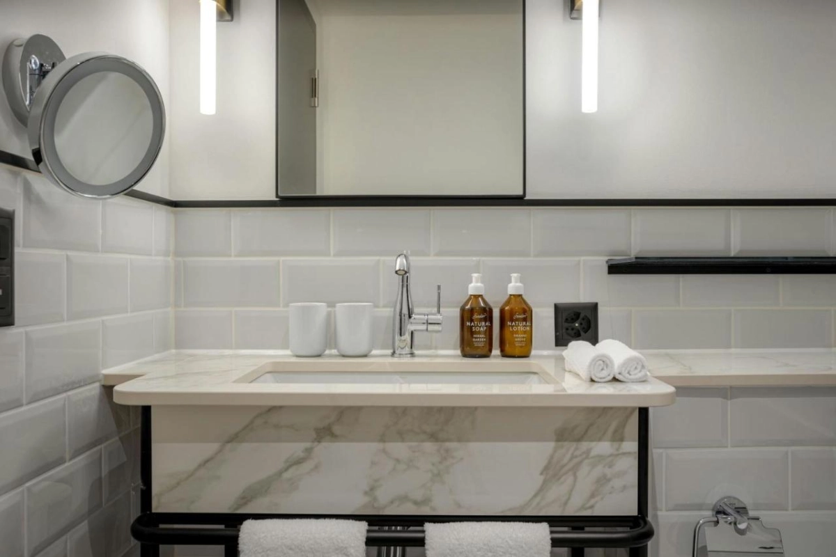 The hotel's 57 rooms and suites are a masterful interplay of natural materials—walnut wood, supple leather, and sleek granite—paired with handcrafted details and curated artworks that spark the imagination. Each sanctuary features the bespoke Neues Schloss Sleep Experience Bed, air-conditioned comfort, Nespresso coffee machines, and plush bathrooms adorned with luxurious toiletries. Select suites open to private terraces with sweeping panoramic views of the Enge district, weaving a seamless blend of retro sophistication and modern indulgence.