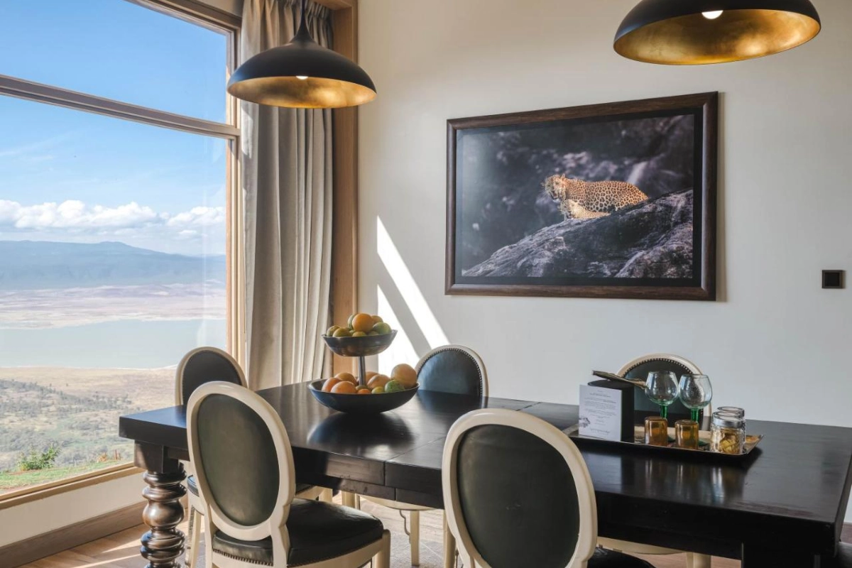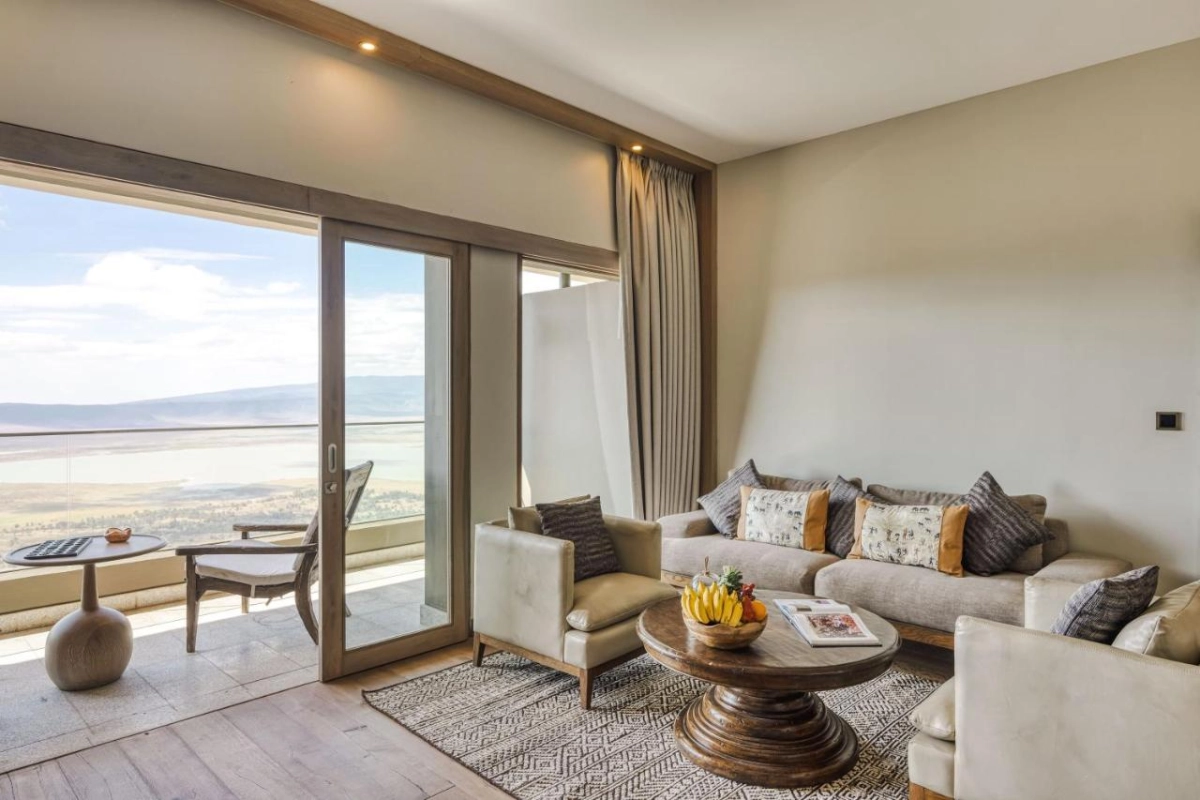 The spacious rooms, crafted with handcrafted Tanzanian decor, feature air-conditioned elegance, cable flat-screen TVs, and private bathrooms with showers and premium toiletries, with select units offering fully equipped kitchens with microwaves. Private terraces open to breathtaking views of the Ngorongoro landscape, immersing guests in the region's natural splendor. The outdoor swimming pool, nestled in lush gardens, invites serene dips, while the spa, complete with a sauna, offers massages inspired by local botanicals. A fitness room supports active pursuits, and curated experiences like 4x4 safaris, walking tours, or Maasai village visits deepen connections to the area's wildlife and culture.