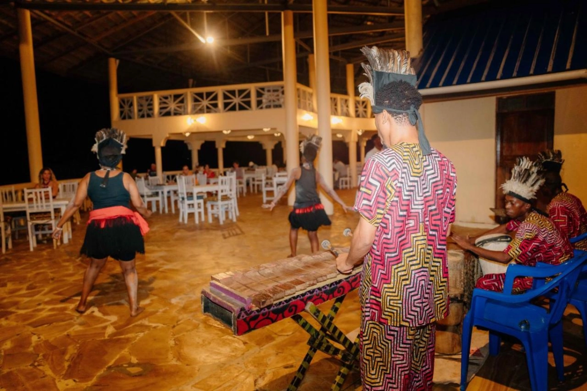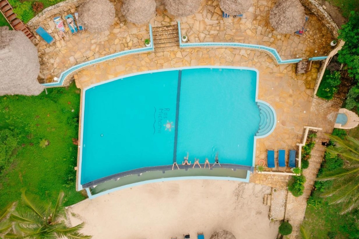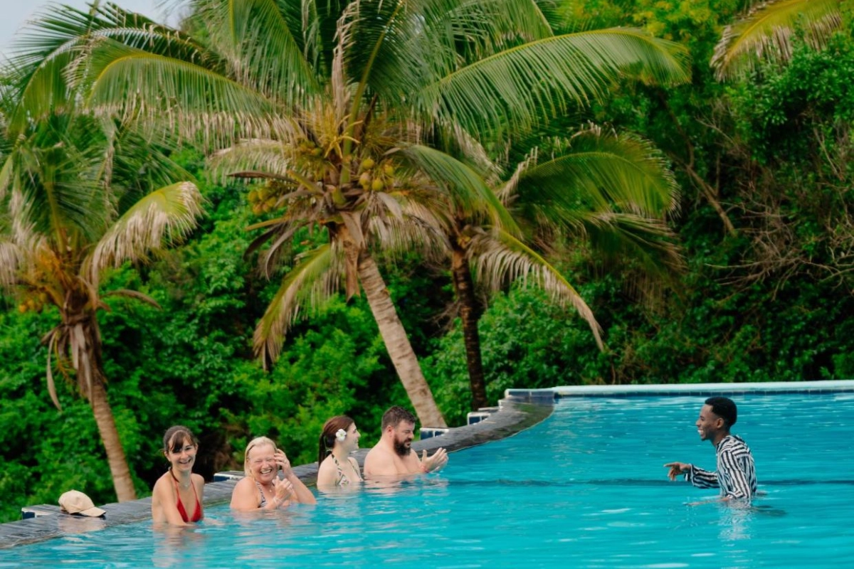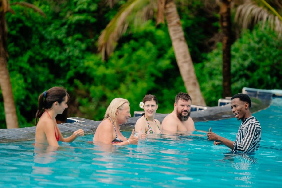 Dining at Pearl Beach Resort is a coastal delight. The cliff-top restaurant, with panoramic ocean views, serves a blend of Zanzibari and international dishes, from fresh-caught fish with clove-infused sauces to vibrant salads bursting with tropical flavours. Breakfast features fresh pastries and island fruits, savoured with Indian Ocean breezes. The lounge bar, steps from the beach, crafts cocktails and non-alcoholic drinks, perfect for sipping during evening entertainment or beachside barbecues. Guests can embark on dhow excursions to explore the coral reefs, join guided snorkeling or fishing trips, or simply relax on the private beaches, immersed in the peninsula's untouched beauty.