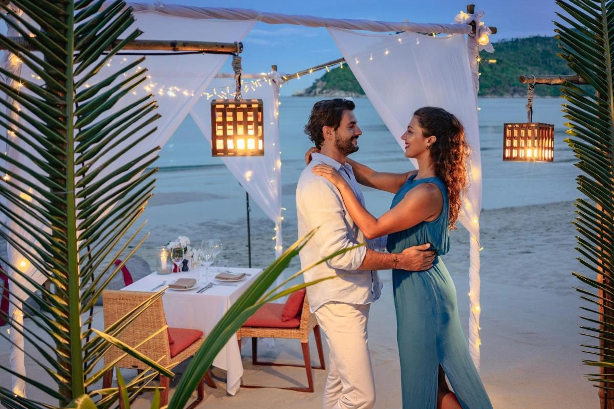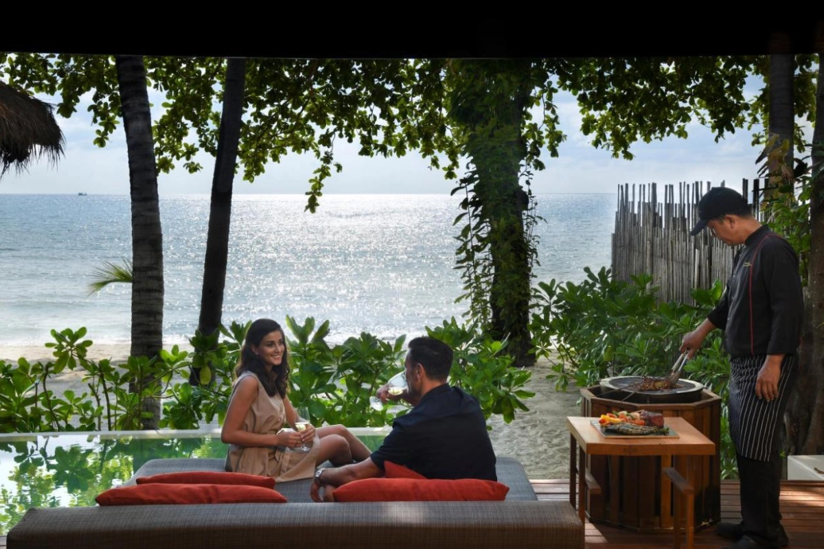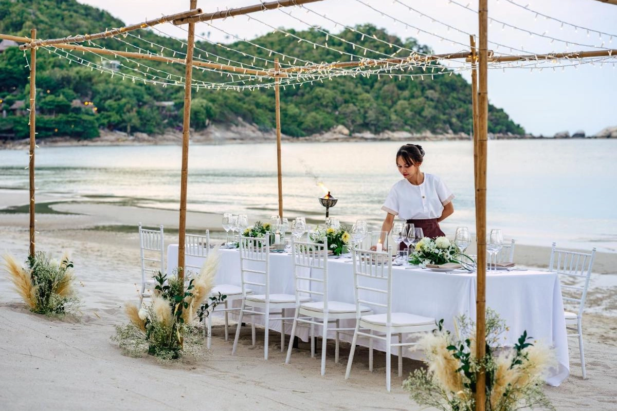 Dining is a sensory journey at Bistro @ The Beach, where outdoor tables frame sea views and a menu blends local Thai flavours with Western dishes, from spicy som tam to fresh seafood platters. Yukinoya delights with fine Japanese cuisine, including signature teppanyaki and sushi, served daily alongside a curated champagne and wine lounge. Private beach dining elevates intimate moments under the stars. Guests can explore the island with curated excursions, such as private boat tours or cycling through lush trails, arranged by the attentive staff.