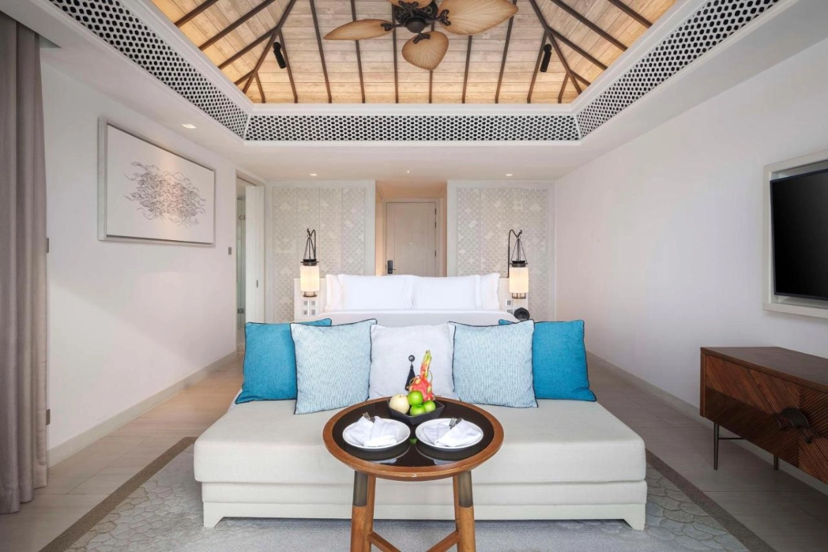 The 101 rooms and villas exude contemporary Thai sophistication, featuring private terraces with sea or garden views, sleek desks, premium coffee machines, minibars, safety deposit boxes, and flat-screen televisions. Spacious bathrooms include bidets, plush toiletries, and deep soaking tubs, with select villas offering private pools. The Banyan Tree Spa, renowned for its rainforest-inspired treatments, delivers rejuvenating massages, while a state-of-the-art fitness centre, sauna, and beachfront yoga sessions invigorate guests. The sparkling outdoor pool and water sports like snorkeling and kayaking enhance the coastal allure.