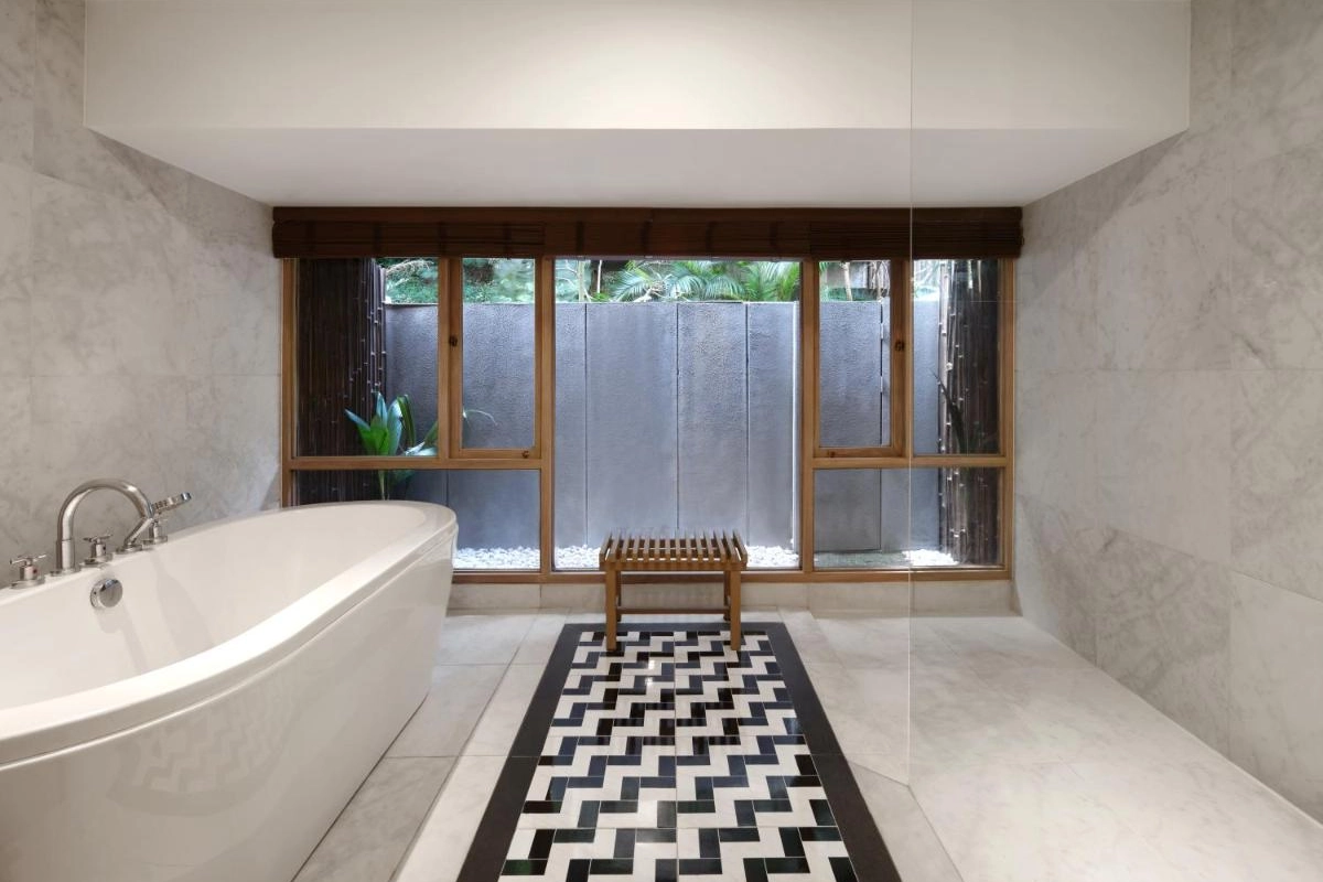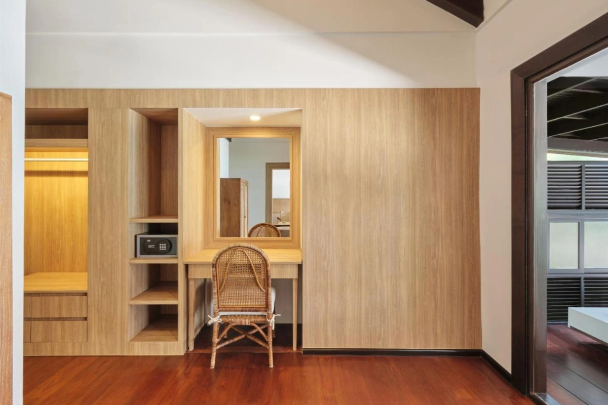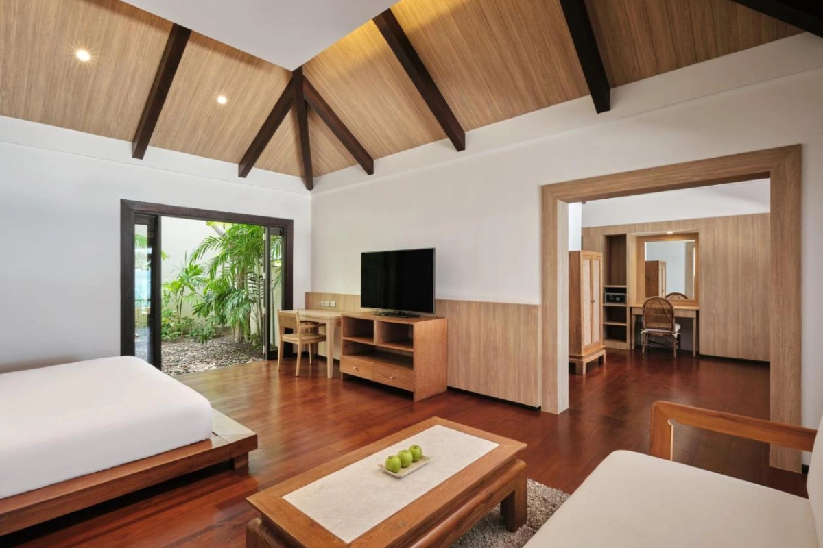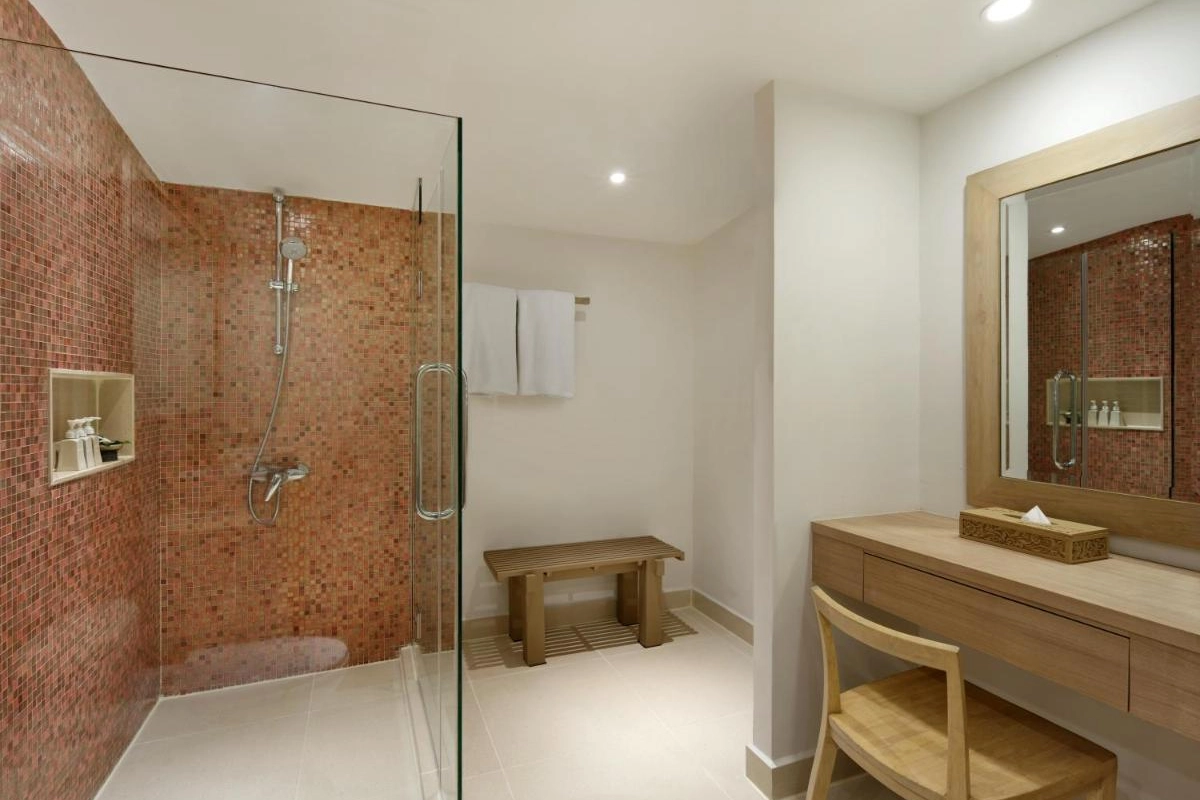 The 83 rooms, cottages, and villas, adorned with elegant wooden furnishings, feature air-conditioned comfort, cable televisions, minibars, and private ocean-view terraces with plush sun loungers. Select terraces include outdoor bathtubs for indulgent relaxation. Spacious bathrooms offer premium toiletries and rain showers. The 8LEMENTS Spa pampers with herbal baths and soothing massages, while two shimmering outdoor pools, a modern gym, and tennis courts invigorate guests. On-site water sports, including kayaking and snorkeling, add thrilling coastal adventures.