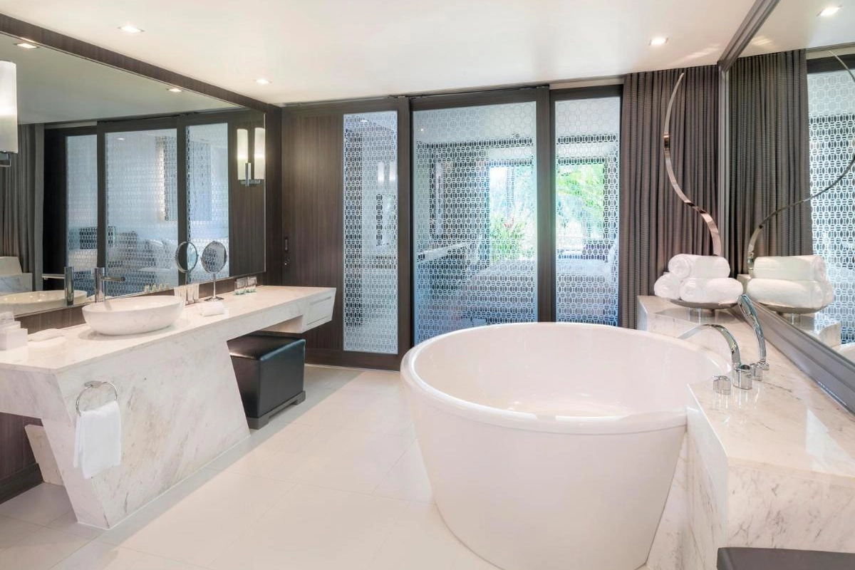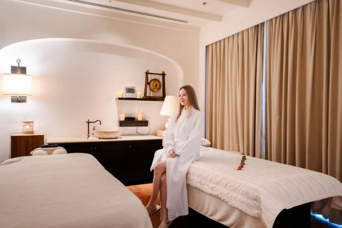 The 223 rooms and suites, adorned with sleek furnishings and artistic touches like the traditional Wai greeting etched into the bespoke LM BED, feature floor-to-ceiling windows and private balconies or terraces with sweeping views of the adjacent golf course. Each air-conditioned haven includes plush bedding, glass-enclosed rain showers, freestanding bathtubs, bathrobes, hairdryers, flat-screen TVs, and coffee facilities, crafting a seamless balance of comfort and style.