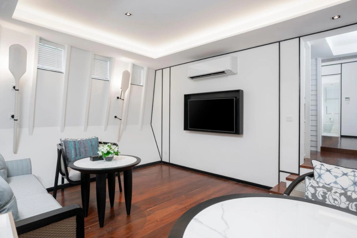 The 159 guest rooms and 41 suites, housed in six low-rise buildings, weave seamlessly into the tropical landscape, featuring air-conditioned elegance, polished wooden floors, flat-screen TVs, and plush bathrooms with premium toiletries. Ground-floor rooms open to spacious verandahs bordering a 700-meter lagoon with jacuzzis, fountains, and a vibrant Pool Bar. The resort's 30 exclusive boat suites, set within private water-framed gardens, showcase restored Thai maritime heritage with stand-alone bathtubs, double showers, and spiral staircases leading to intimate bedrooms with private decks and plush day beds.