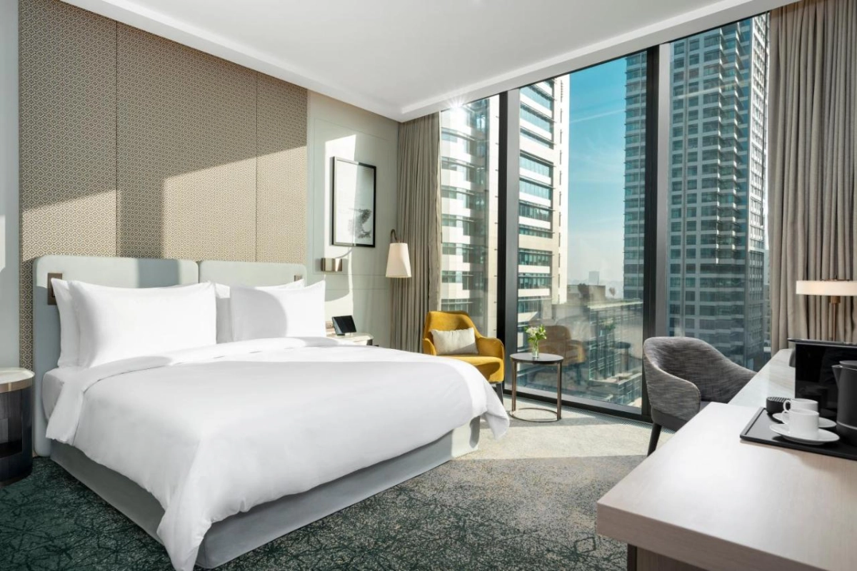 The 320 rooms and suites are designed with refined comfort, featuring air-conditioned spaces, flat-screen TVs, coffee machines, minibars, and private bathrooms with showers and premium toiletries. Many rooms offer captivating city views, complemented by thoughtful amenities like iPads and kettles, creating an indulgent retreat for couples or solo guests.
