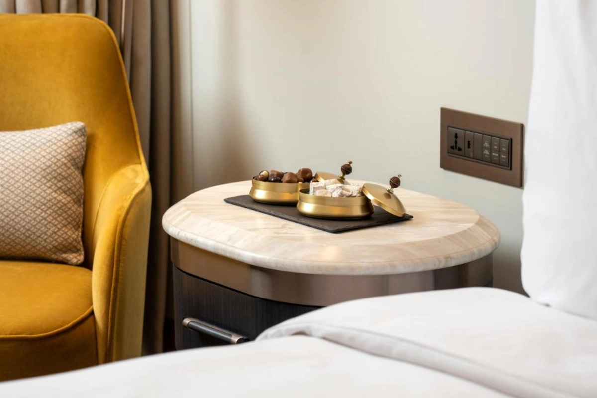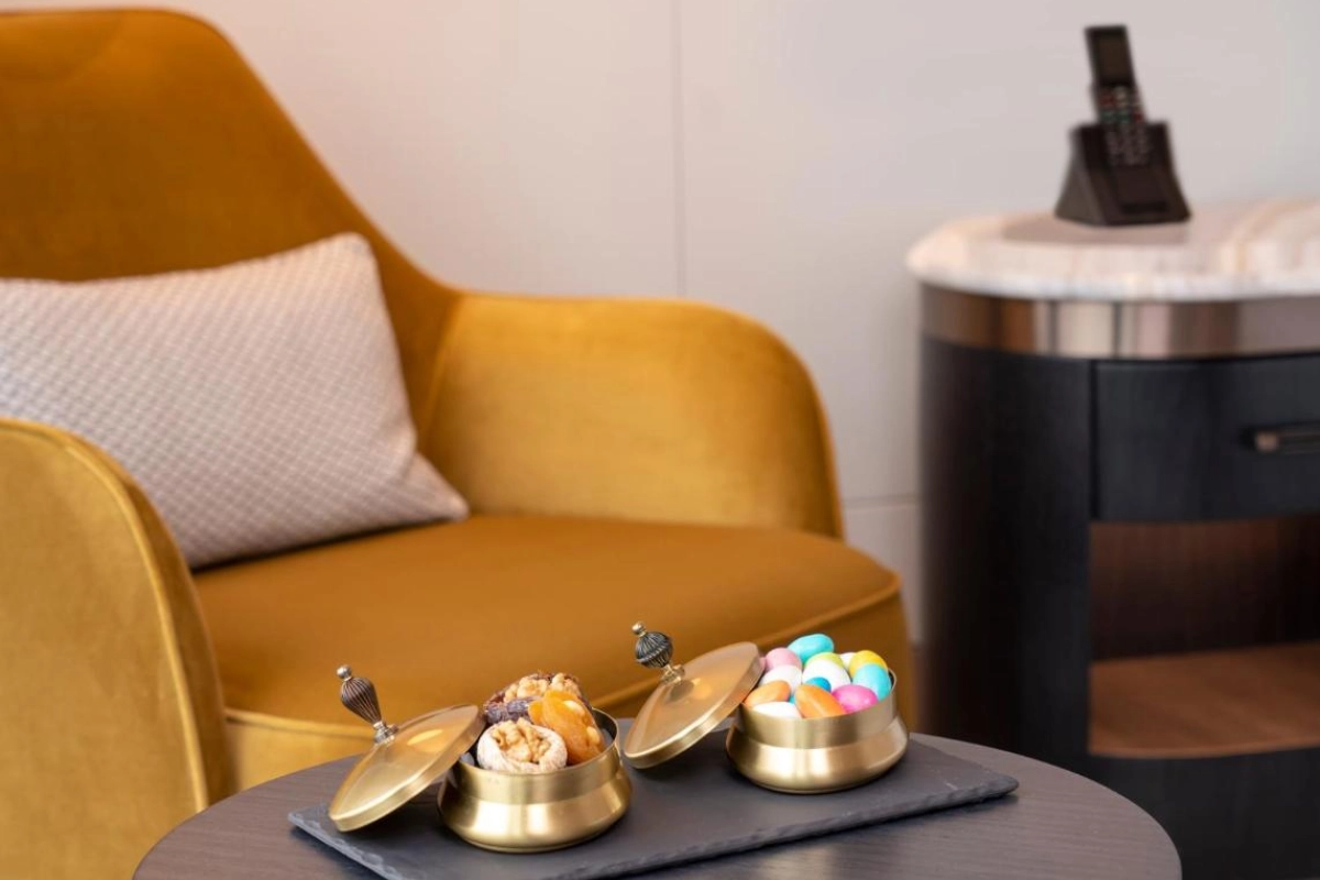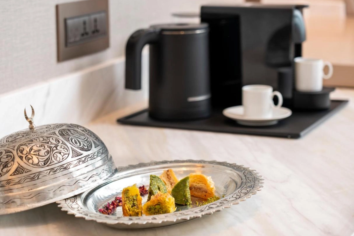 Dining at the hotel's signature restaurant delights with a lavish buffet breakfast, showcasing Turkish and international flavours, from fresh pastries to savoury local dishes. Lunch and dinner menus elevate culinary artistry with carefully crafted meals, served in a stylish setting. The chic bar offers a curated selection of cocktails, wines, and light bites, perfect for unwinding in a sophisticated ambiance. Leisure thrives with an indoor pool, sauna, and traditional hammam, offering serene relaxation. The state-of-the-art fitness centre caters to active guests, while the shared lounge provides a tranquil space to connect or relax. Curated experiences, such as private city tours arranged by the 24-hour concierge, immerse guests in Istanbul's vibrant culture.