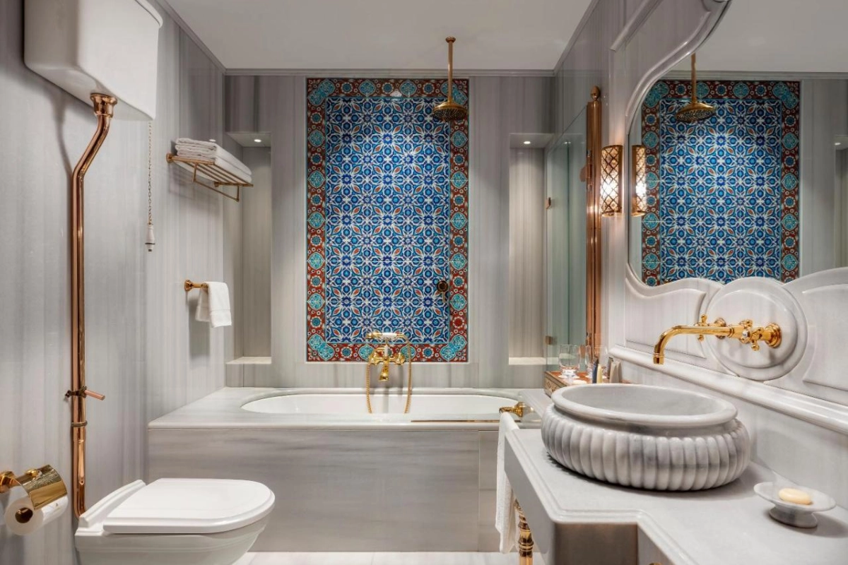 The 61 rooms and suites, adorned with handcrafted mother-of-pearl furniture, silk Tabriz carpets, and hand-painted tiles, feature Loewe Ultra HD TVs, electronic curtains, air conditioning, underfloor heating, and M Line Slow Motion beds. Private bathrooms with Dornbracht fittings and bespoke marble work create an opulent retreat, enriched with tea and coffee setups and artwork by renowned Azerbaijani artists like Sattar Bahlulzade and Maral Rahmanzade.