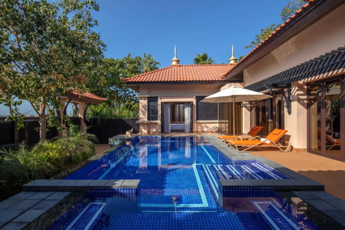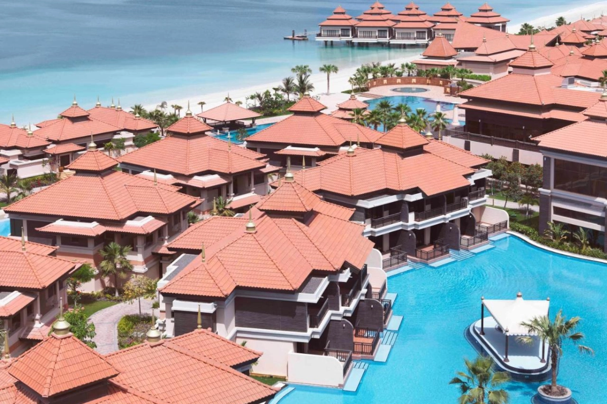 Anantara The Palm Dubai Resort, a five-star jewel on Dubai's iconic Palm Jumeirah, dazzles with Thai-inspired elegance, blending 400 meters of private shoreline with lush gardens for a captivating coastal sojourn.