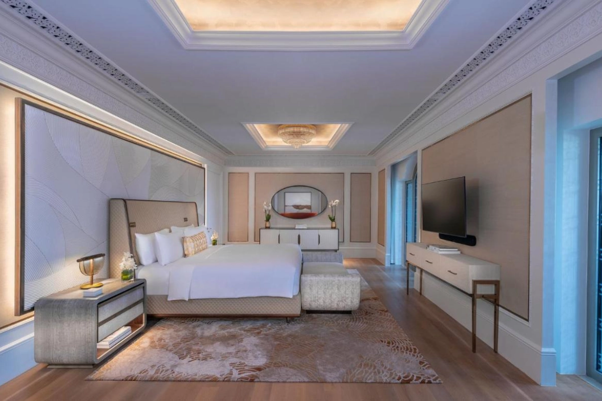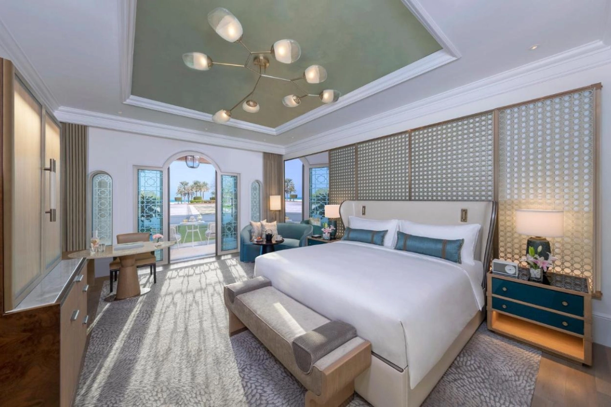 Emirates Palace Mandarin Oriental, Abu Dhabi, a five-star resort on a 1.3 km private beach, exudes opulent Arabian elegance, blending silver, gold, and glass mosaics with captivating natural bay vistas.