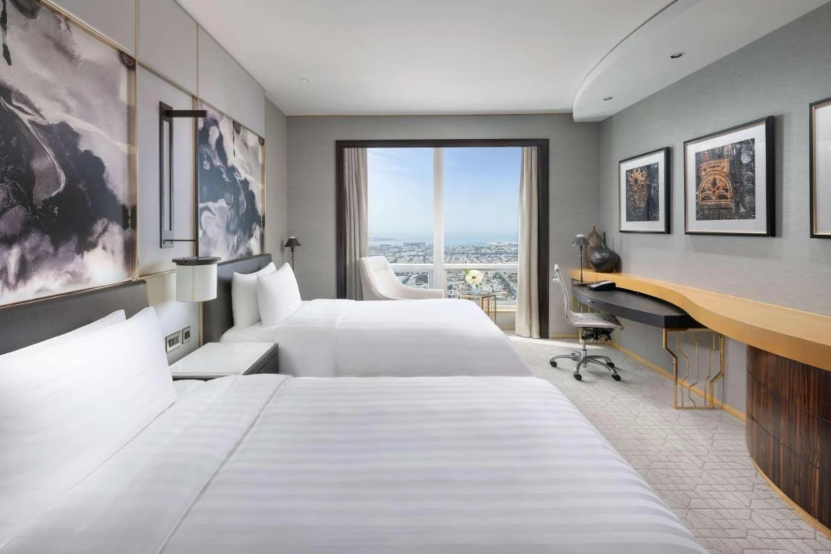 The 302 rooms and suites are thoughtfully designed with geometric patterns and warm tones, blending contemporary luxury with cultural accents. Each features floor-to-ceiling windows showcasing breathtaking views of the Downtown Dubai skyline or the Arabian Sea, complemented by deep soaking bathtubs, walk-in showers, flat-screen TVs, and fully stocked minibars. Private workspaces ensure comfort for business travellers, while plush bedding creates an inviting space for relaxation.