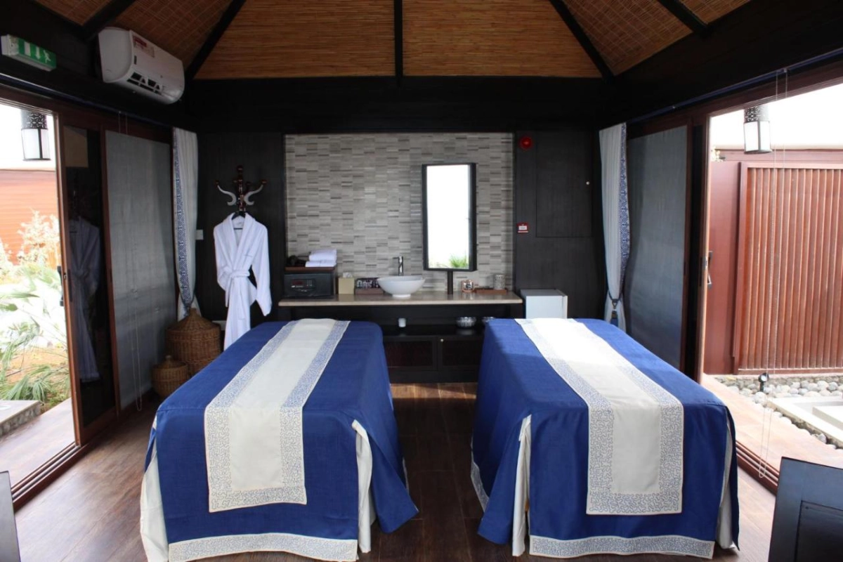 Each villa is a haven of modern sophistication, featuring marine-inspired blue and white décor, floor-to-ceiling windows, and flat-screen TVs. Spacious interiors include plush bathrooms with premium toiletries, while private patios with infinity pools open directly to the beachfront, offering unique pool deck dining experiences. The design seamlessly integrates with the natural landscape, creating a serene and indulgent retreat.