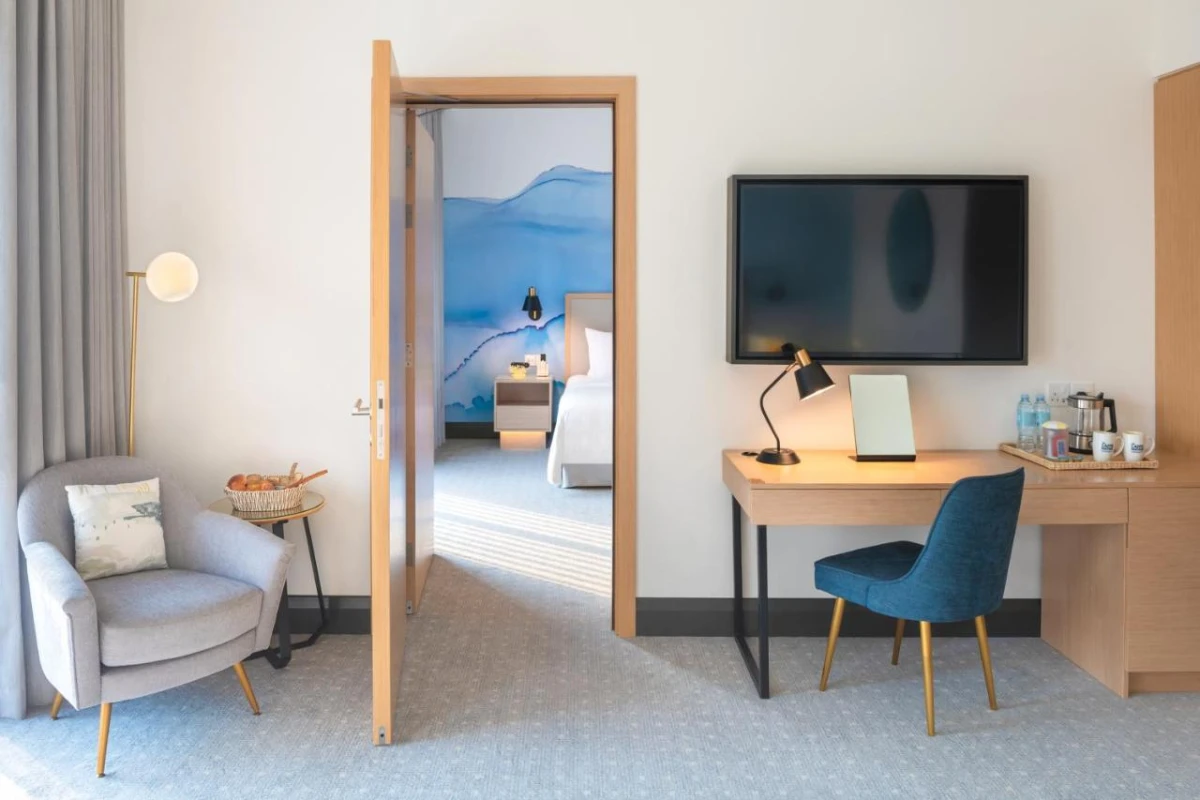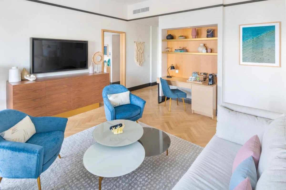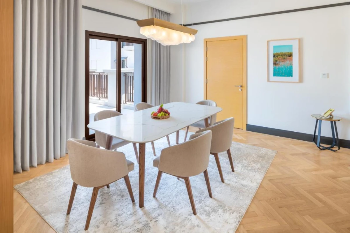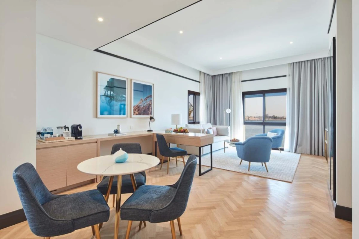 The 138 air-conditioned rooms and suites are designed with modern elegance, featuring spacious wardrobes, electric kettles, and private bathrooms with premium toiletries. Select accommodations offer terraces with sweeping views of the gulf or Umm Al Quwain's charming cityscape, creating a refined haven for relaxation. The minimalist design, infused with soft coastal tones, ensures a serene and sophisticated stay.