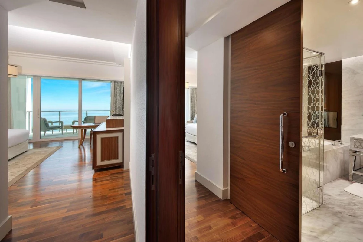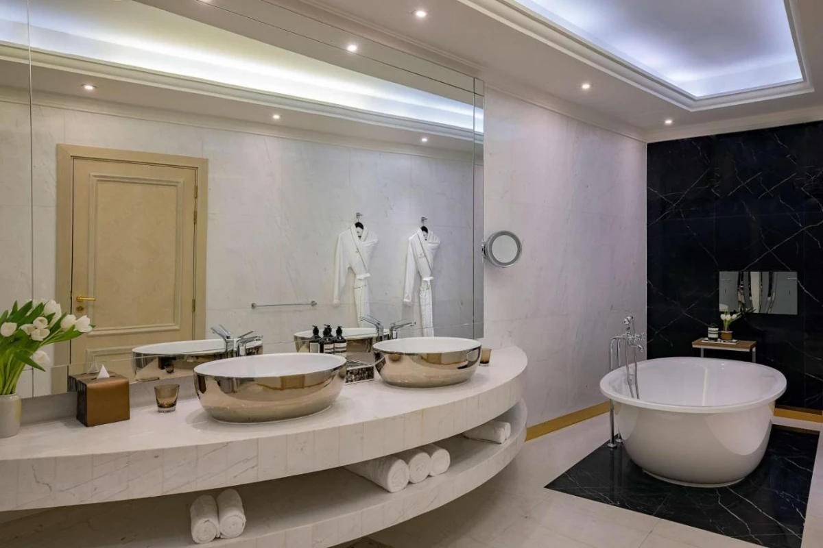 The 319 spacious rooms and suites are adorned with contemporary elegance, featuring signature Waldorf Astoria beds, large balconies with stunning sea or skyline vistas, and white marble bathrooms with spacious bathtubs equipped with TVs, walk-in showers, and luxury amenities. Each accommodation includes a comfortable seating area, workstation, and 42-inch flat-screen TV, blending modern sophistication with serene comfort for a refined escape.