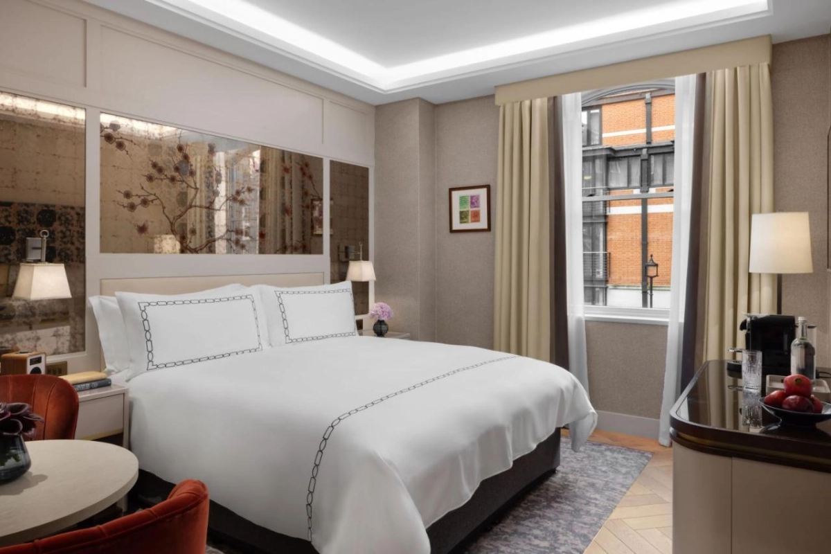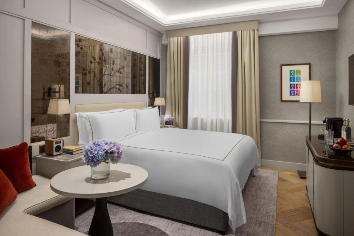 Nestled steps from Bond Street, this elegant property features 250 luxurious rooms, 49 suites, and 8 signature suites, each designed to evoke the grandeur of a stately home. Spacious interiors boast plush bedding, Italian marble bathrooms, Ruark sound systems, smart TVs, espresso machines, and minibars, creating an ambiance of refined sophistication. Many rooms offer stunning views of Grosvenor Square, seamlessly blending modern comfort with timeless elegance.