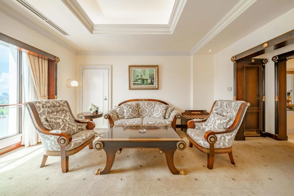 The 283 elegantly furnished rooms and suites exude tranquility with neutral tones, oversized windows showcasing Saigon River or city views, and cable flat-screen TVs. Spacious bathrooms feature washlet toilets and premium toiletries, complemented by comfortable seating areas, minibars, and safes, creating a refined sanctuary that marries modern comfort with cultural motifs like the sun-patterned bronze drum at each entrance.