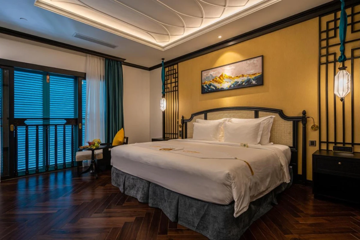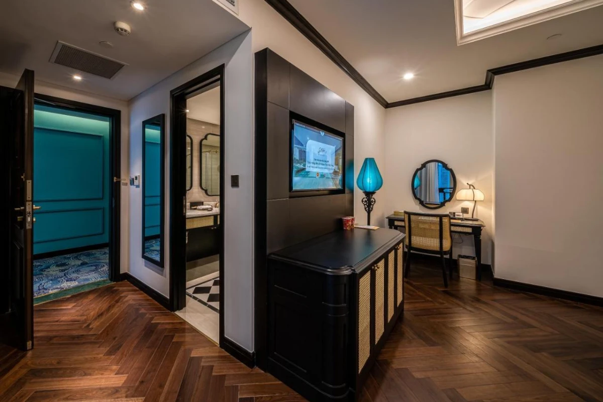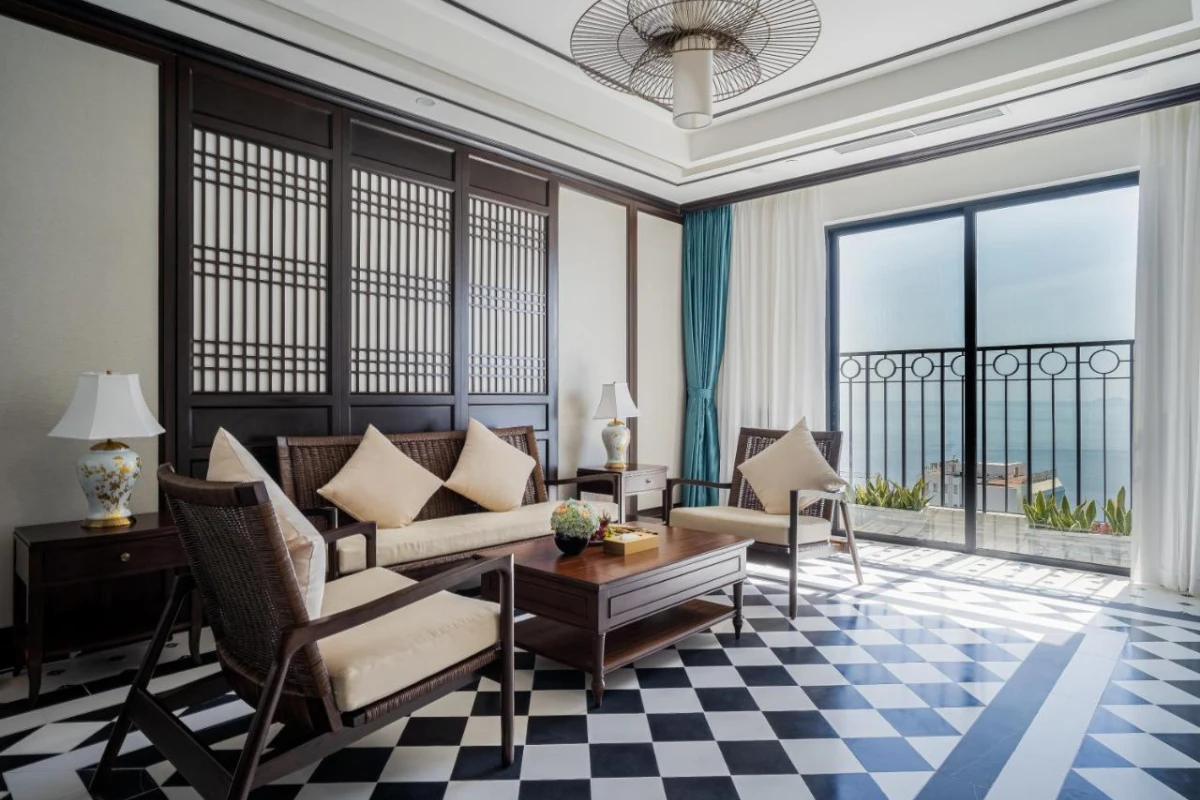 The hotel's 151 rooms and suites are a harmonious blend of heritage and modernity, featuring air-conditioned interiors with polished wooden accents, flat-screen TVs, minibars, safes, and private bathrooms with bidets and premium toiletries. Each accommodation offers private balconies showcasing lush vertical gardens or sweeping views of Nha Trang Bay, creating a serene ambiance for relaxation. Spacious suites elevate the experience with elegant living areas, perfect for couples or those craving extra indulgence.