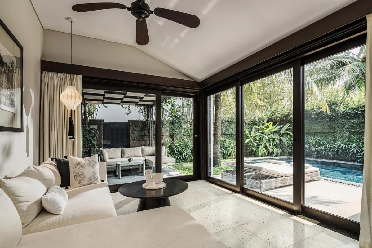 Each modern Vietnamese-style villa features air-conditioned interiors with open-plan living rooms, flat-screen TVs, minibars, safes, and spacious bathrooms with oversized windows, separate bathtubs, and rain showers. Private courtyards with personal pools offer stunning sunset views, creating a serene space for relaxation and reflection, ideal for couples or solo travellers.